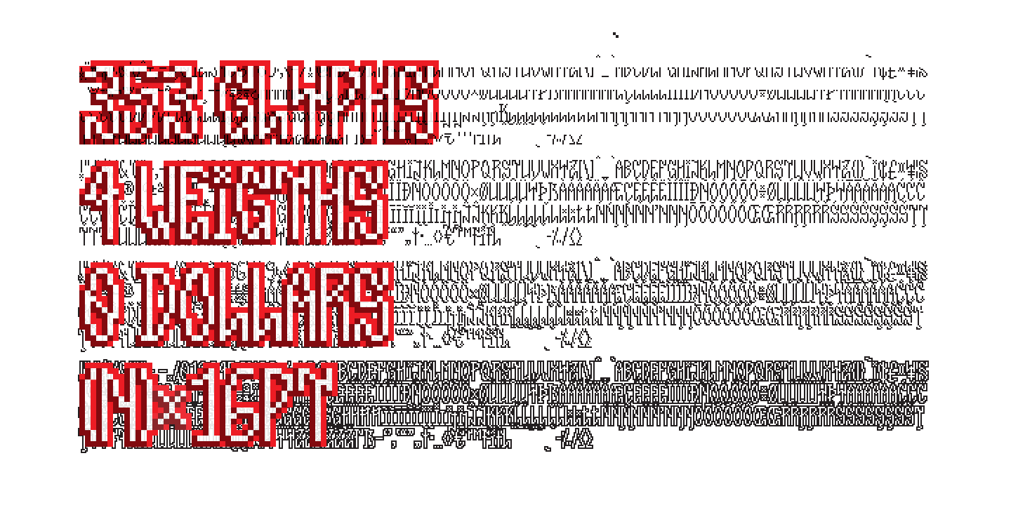 Pixel Reto é uma fonte que adapta os traços do ‘pixo reto’ para as restrições do ‘pixel grid’ das telas de baixa resolução. A família possui quatro variações de estilo com as mesmas métricas, que podem ser empilhados e recombinados para a criação de letreiros decorativos.